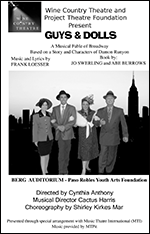 Gambler, Nathan Detroit runs a "floating" crap game, much to the disgust of his long suffering fiancé of 14 years, the Hot Box night club singer, Adelaide. To raise the money to pay for a venue for his crap game, he bets $1000 on what he believes is a sure thing. Sky Masterson, a high rolling, suave gambler boasts that he can have any girl he wants. So Nathan bets him that he can't get the local "Save A Soul" missionary, Sarah Brown to come to dinner with him in Havana. She is reluctant, so Sky, in turn, guarantees that he will provide 12 "genuine sinners" for her midnight prayer meeting in return for a dinner date. Confusion, mayhem and hilarity ensue as gangsters, singers, sinners, show girls and Salvation Army saviors collide in this fable of Broadway that is sure to entertain you with memorable songs such as "Sit Down, You're Rockin' the Boat", and "Luck be a Lady" made famous by icon, Frank Sinatra.