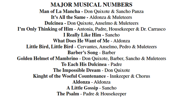 Emy Bruzzo as Aldonza/Dulcinea, Larry Baldwin as Miguel De Cervantes/Don Quixote/Alonso Quijana, & Kyle Morillo as Sancho Panza